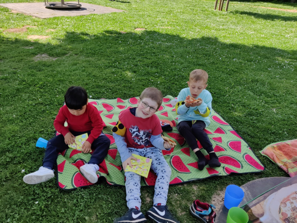 Alles neu macht der Mai: Endlich nicht mehr drinnen essen, sondern auch mal draußen bei diesem tollen Frühlingswetter. Das sagten sich die jüngsten Schäfer-Schüler aus der Vorklasse mit ihrer Klassenlehrerin Denise Schütte und ihrer Erzieherin Barbara Bielke. Also machten sie sich zu Fuß auf den Weg nach Ockstadt. Dort tobten Lionel, Lara, Artin, Karl und Ayaz erst einmal auf den Spielgeräten des Spielplatzes, bis der große Hunger kam. Die schicke Picknick-Decke mit Wassermelonen-Motiv wurde ausgepackt, aber zu essen gab es etwas anderes: Hm, Pizza, die allen lecker schmeckte :-)