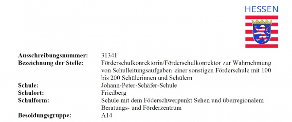 Die Stelle der 2. Förderschulkonrektorin/ des 2. Förderschulkonrektors für unsere Einrichtung ist nun ausgeschrieben. Bewerbungsschluss ist der 06.12.2017.