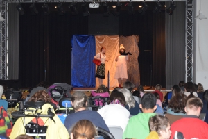 Vorweihnachtliche Stimmung in der Johann-Peter-Schäfer-Schule Friedberg: Gespannt und mit großem Interesse verfolgten die Kinder und Jugendlichen in der sehr gut gefüllten Aula die Aufführung des Märchens "Sterntaler". Förderschullehrerin Gudrun Lang freute sich, das Galli Theater Frankfurt für einen Gastspieltermin in Friedberg gewonnen zu haben: "Für unsere Klassen mit mehrfachbeeinträchtigten Schülern ist es nicht so einfach, Lehrausflüge zu unternehmen, da immer auch einige Rollstühle mitgenommen werden müssen. Das ist logistisch manchmal schwierig. Daher ist umso schöner, ihnen hier bei uns ein Theaterstück präsentieren zu können." Es gelang den Darstellern Karola Diestel und Jenny Seewald, mit der modernen Variante der Geschichte Groß und Klein zu begeistern. Mit fetziger Musik und einigen Rollenwechseln erlebten die Schüler eine vergnügte Vorstellung. Die direkte Begegnung mit den Darstellern, die mit Fragen die Kinderin die Handlung einbezogen, rundete eine in allen Belangen gelungene Vorstellung ab. "Da der Besuch des Theaters viel Anklang fand, ist der Termin im nächsten Jahr schon fest eingeplant", verriet Organisatorin Lang.