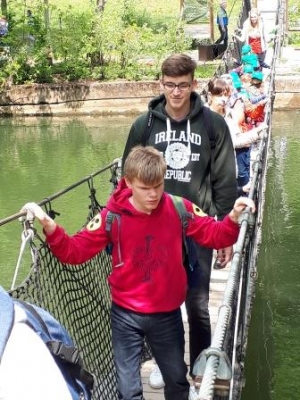 Die Hängebrücke ist etwas wacklig, sie schwankt beim Laufen ein wenig hin und her. Ein Problem ist das nicht für Tobias Benzing. Der 16-Jährige meistert diese Aufgabe auch deshalb ohne Schwierigkeiten, weil er sich auf Felix Selzer verlassen kann. Selzer absolviert sein Freiwilliges Soziales Jahr an der Johann-Peter-Schäfer-Schule Friedberg (Schule für Blinde und Sehbehinderte) und ist in zwei Klassen der Abteilung mit dem Förderschwerpunkt Geistige Entwicklung eingesetzt. Mit einer der Klassen unternahm der 19-Jährige Anfang Mai eine fünftägige Schullandheimfahrt nach Nürnberg, wo unter anderem der Besuch des "Erfahrungsfelds zur Entfaltung der Sinne" samt Herausforderung Hängebrücke auf dem Programm stand. Generell gestaltet sich Selzers Tätigkeitsbereich auch in der Schule in Friedberg sehr vielfältig. Ob als Begleitung im Sport-, Hauswirtschafts-, Sach- und Kunstunterricht, als Hilfe bei Unterrichtsgängen außerhalb des Schulgeländes, Lehrausflügen oder als Unterstützung in den Förderräumen und beim Erlernen lebenspraktischer Fertigkeiten: Langeweile kommt nie auf. Von Beginn an sehr gut betreut fand sich Selzer von den Lehrkräften und Erzieherinnen im Schuldienst. "Ich bin super angeleitet worden, sodass ich mich schnell wohl gefühlt habe. Alle haben ein offenes Ohr und die Zusammenarbeit mit dem Kollegium und den Schülern macht richtig Spaß." So sehr, dass sich Selzer in Sachen Berufswunsch nicht zuletzt aufgrund der positiven Erfahrungen an der JPSS inzwischen sicher ist. "Ich möchte Förderschullehramt studieren", erklärt er und nimmt persönlich jede Menge mit aus den letzten zehn Monaten: "Die Kinder und Jugendlichen können so viel - das nimmt die man auf den ersten Blick oft gar nicht richtig wahr. Ich habe gelernt, dass man sich auch über kleine Dinge freuen kann." Gleichzeitig profitiert natürlich die Schule. Förderschullehrerin Friederike Kern, seitens der Schule zuständig für die Betreuung der FSJler, bestätigt derweil die Wichtigkeit der jungen Menschen für die Einrichtung: "Freiwillige wie Herr Selzer sind eine echte Stütze für uns, da sie uns helfen, den individuellen Förderbedarf umzusetzen." Bald heißt es für Felix Selzer jedoch Abschied zu nehmen, sodass die JPSS auf der Suche ist nach "Nachwuchs" für das kommende Schuljahr 2019/20. Insgesamt sind sechs Stellen zu besetzen. Wer Interesse hat, kann sich bei Friederike Kern (E-Mail: Diese E-Mail-Adresse ist vor Spambots geschützt! Zur Anzeige muss JavaScript eingeschaltet sein!, Telefon: 0173/6610199) oder beim Träger, der Volunta in Gießen (E-Mail: Diese E-Mail-Adresse ist vor Spambots geschützt! Zur Anzeige muss JavaScript eingeschaltet sein!) informieren. Bewerbungen sind auch auf der Internetseite www.volunta.de möglich.
