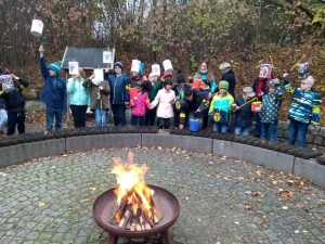 Um kurz vor acht Uhr wurde es dunkel in den Fluren der JPSS. Ein Stromausfall? Einige der älteren Schülerinnen und Schüler sowie die Lehrkräfte und Erzieherinnen aus der Mittel-, Haupt- und Berufsorientierungsstufe werden das vielleicht gedacht haben. Die Kleinsten, unsere Grundschul- und Vorklassenkinder, wussten es viel besser: Die Sankt-Martins-Feier warf ihre Schatten voraus. Bereits kurz nach Unterrichtsbeginn zogen die Kinder von der zweiten in die erste Etage und holten dabei alle Klassen ab. Mit dabei hatten sie ihre mit viel Liebe gebastelten Laternen, die in der Dunkelheit wunderbares buntes Licht spendeten. Dazu sangen sie viele Martins-Lieder wie "Lasst uns froh und munter sein" oder "Laterne, Laterne" und sorgten damit im gesamten Schulgebäude für eine tolle Stimmung. Währenddessen bereitete die Klasse Streffing im Schulgarten das Martinsfeuer vor, um das sich anschließend alle Kinder versammelten, um sich zu wärmen, weitere Lieder zu singen und die von Klasse Scheifele gebackenen Schokobrötchen zu verputzen.