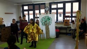 Luisa:Markus und ich haben den Apfelbaum auf den Vorhang gestempelt. Und Frau Heller hat den Umhang für Goldmarie genäht.